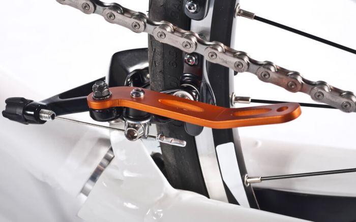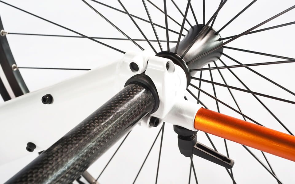 La jonction entre la structure et la fourche est très robuste. Ceci permet d’obtenir une réduction significative de la flexibilité, d’améliorer l’efficacité de propulsion et la performance globale du handbike.